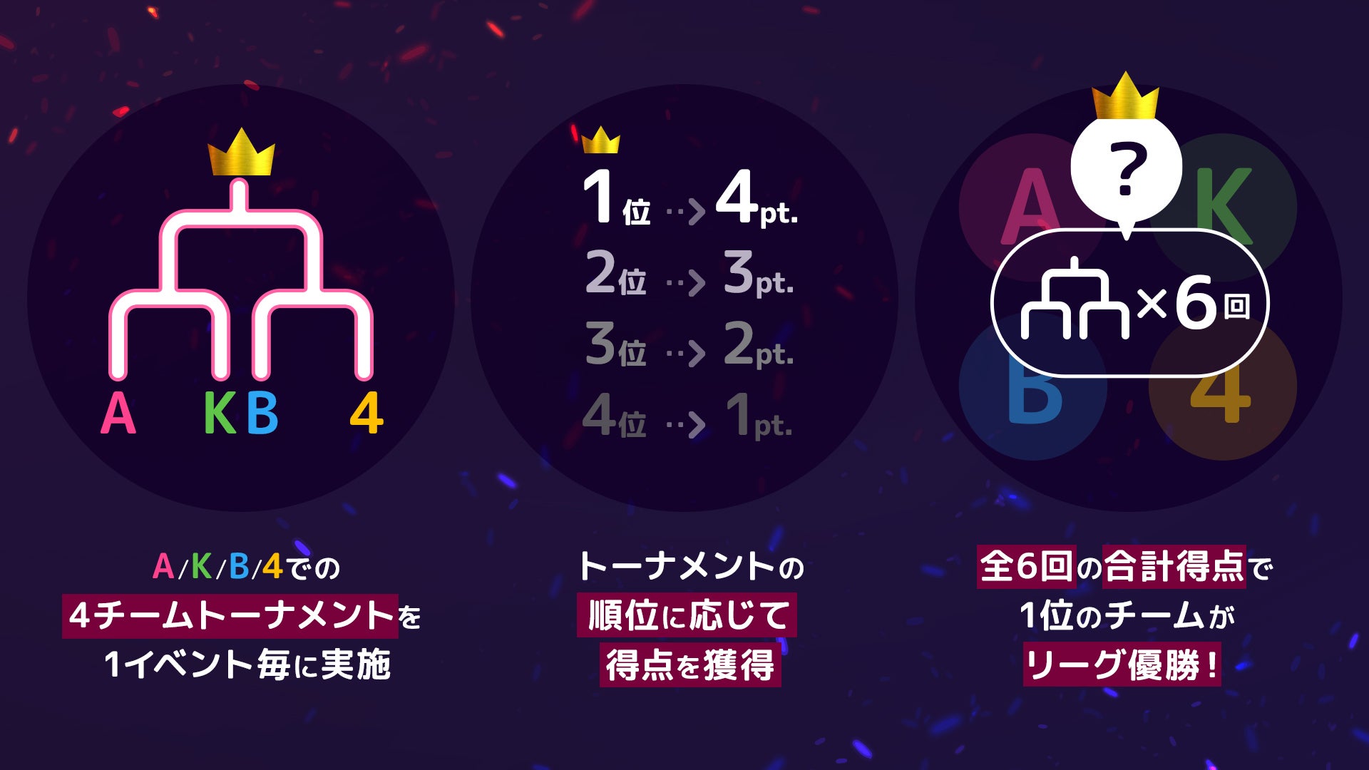 各イベントでA/K/B/4の4チームでトーナメントを実施。全6回の合計ポイントで優勝チームが決まります。