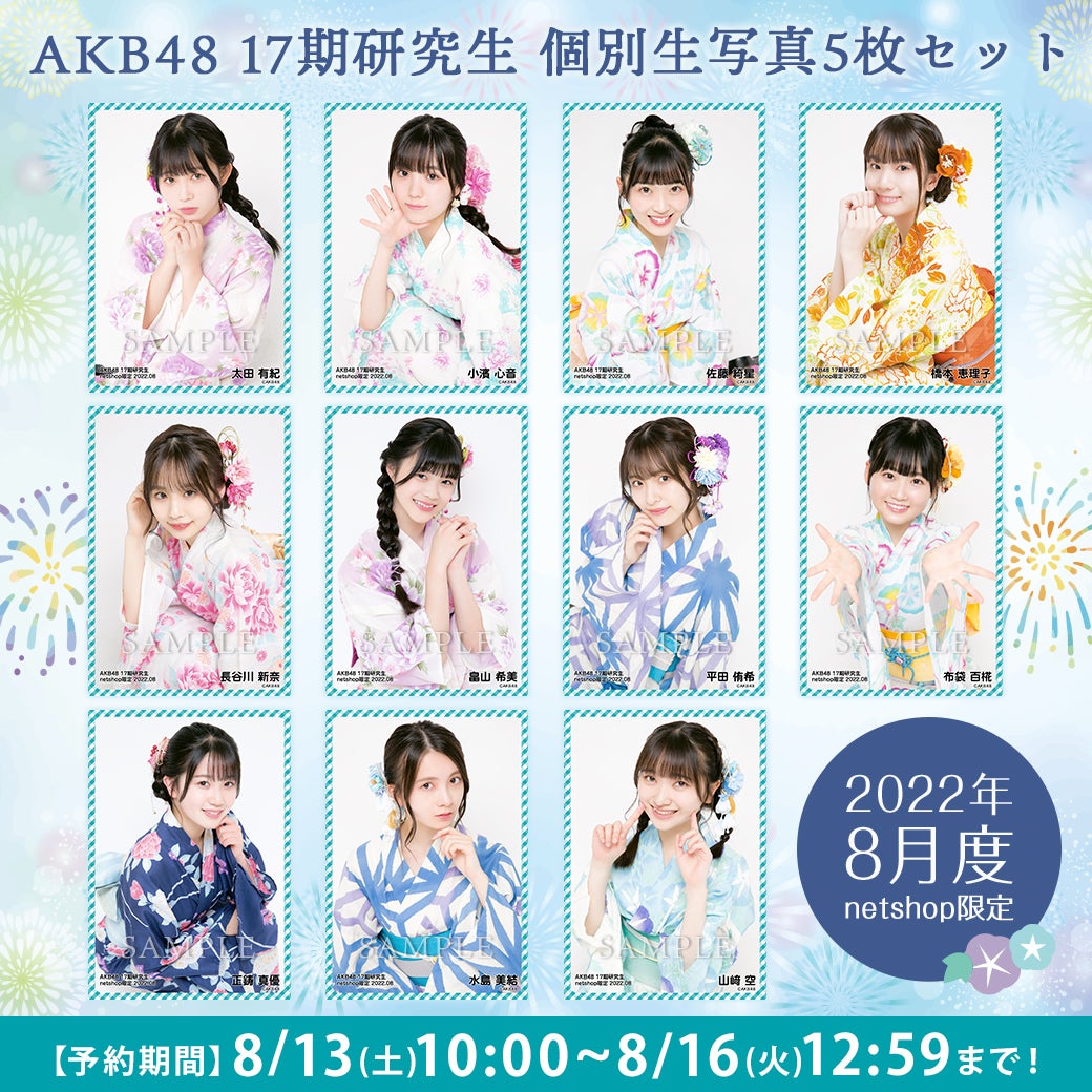 AKB48 17期研究生 2022年8月度 net shop限定個別生写真5枚セット | AKB48 Official ShopAKB48 Official Shopが販売するAKB48 17期研究生 2022年8月度 net shop限定個別生写真5枚セットの販売ページです。AKB48 Official ShopはAKB48の公式通販サイトです。メンバー個別グッズやライブグッズ、生誕グッズ、生写真をはじめ、CDやDVD&Blu-rayも取扱い中!shop.akb48.co.jp