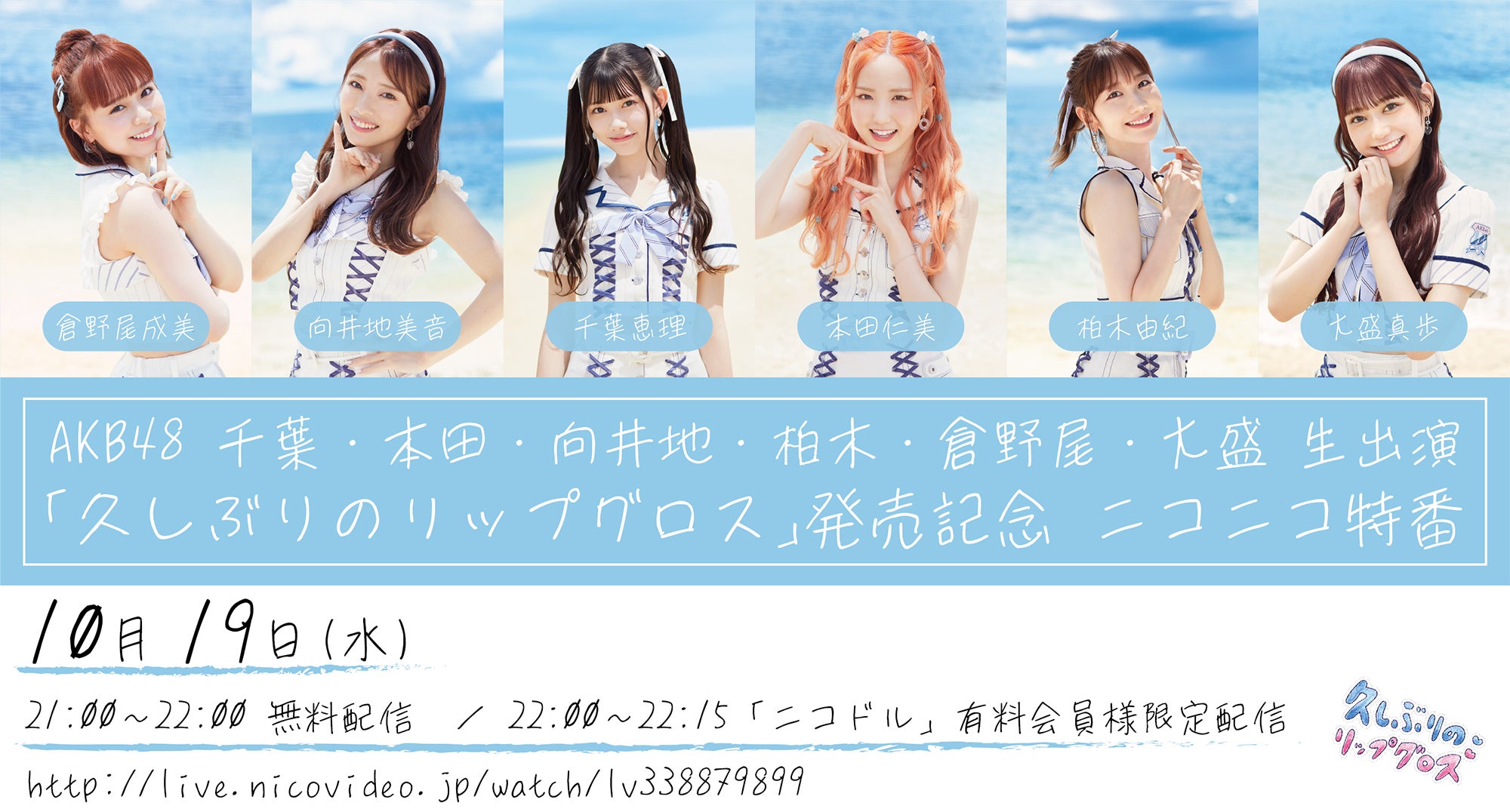 配信には、「久しぶりのリップグロス」でセンターを務める千葉恵里をはじめ、選抜メンバーの大盛真歩・柏木由紀・倉野尾成美・本田仁美・向井地美音が生出演します!