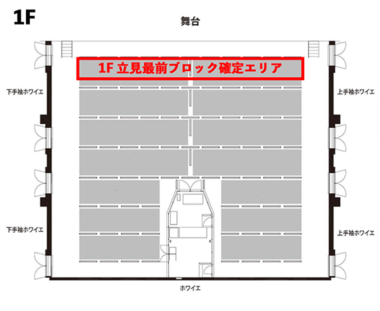 ※【① 立見最前ブロック確定】と【⑥ 2F カメコ席】に関しては、上図のエリアをご確認のうえお申し込みください。