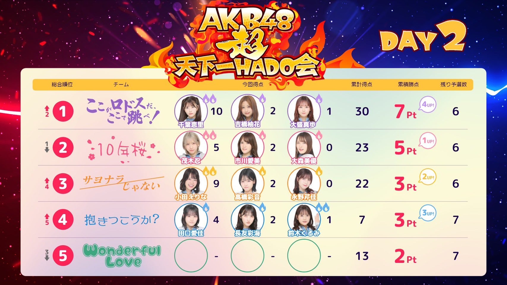 早くも激戦のDAY2を終え、現在の順位は以下の通りになります。