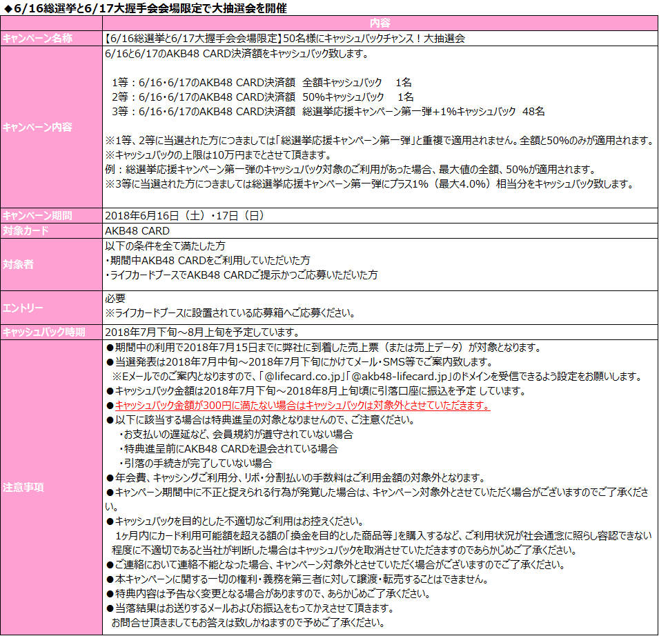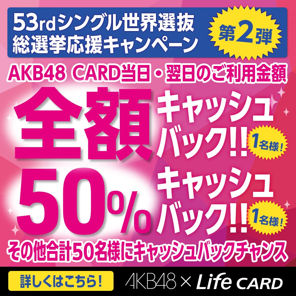 抽選で50名様にキャッシュバックチャンス!1等は6/16と6/17のAKB48 CARDショッピングご利用分を全額キャッシュバック!