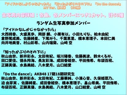 ※ランダム生写真は「アイドルなんかじゃなかったら」「知ったかぶりのその下に」「Do the dance!」各曲、各メンバーにつき1カット、計50種となります