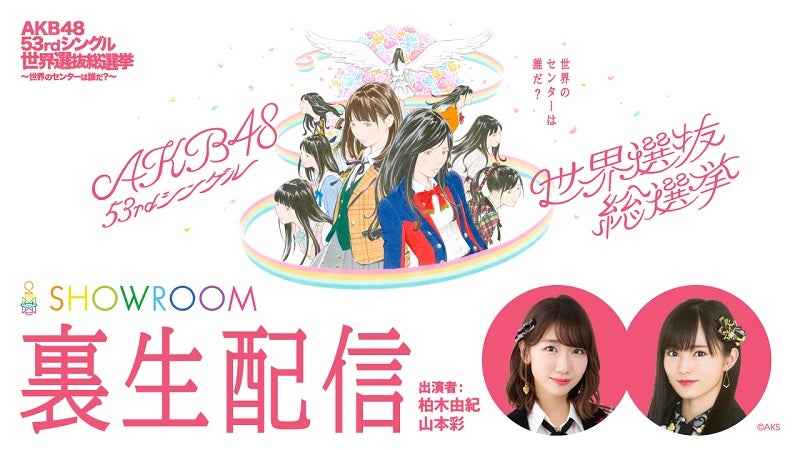 AKB48 53rdシングル 世界選抜総選挙会場の舞台裏特設ブースから、MCにAKB48・NGT48兼任の柏木由紀、NMB48山本彩に加え、タイムマシーン3号、和賀勇介を迎え、
