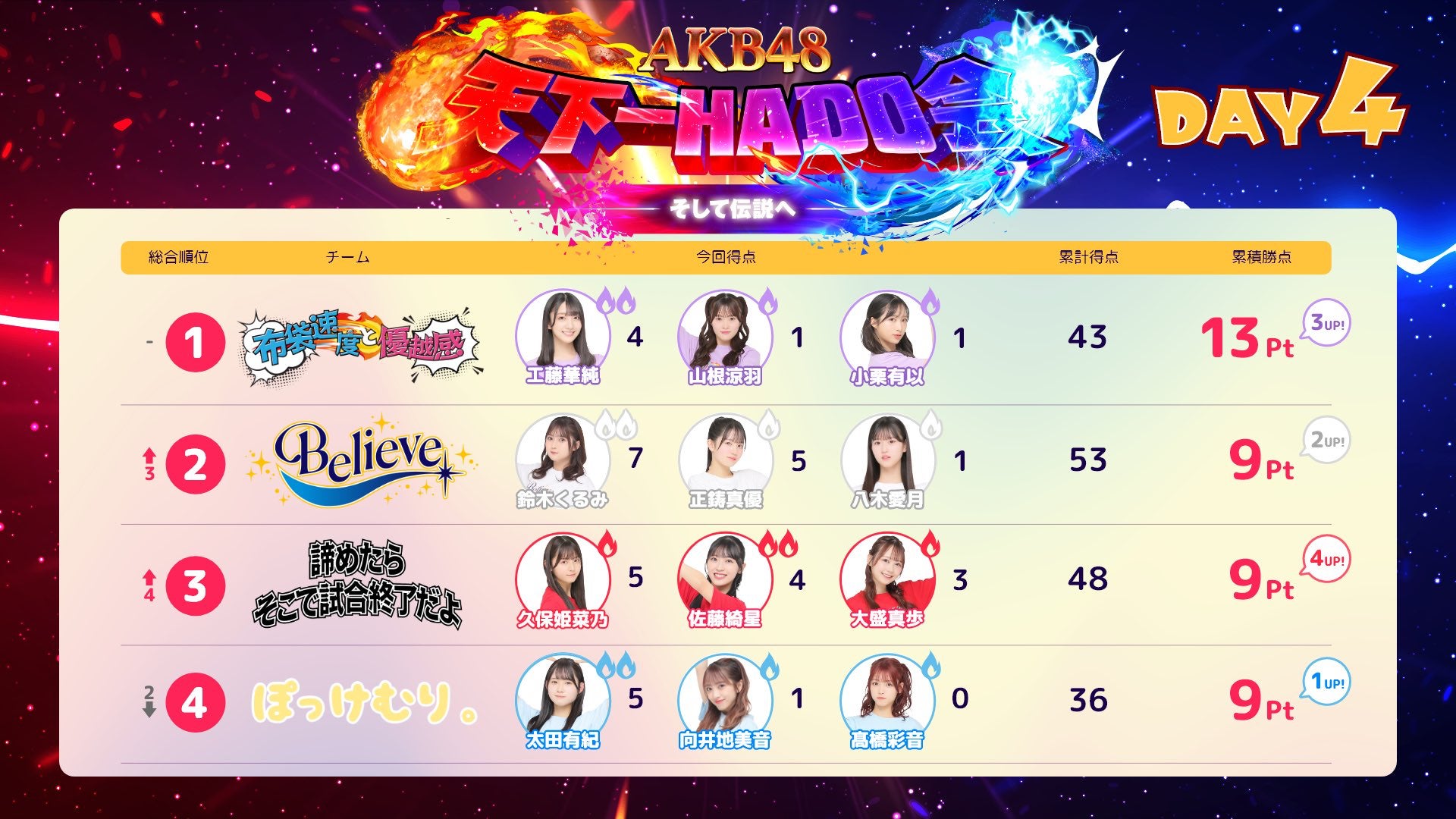 大盛真歩・田口愛佳・布袋百椛・山内瑞葵がキャプテンとなり、ドラフトを行い、新たなチーム編成で迎えた、新シーズン「AKB48天下一HADO会 そして伝説へ」!!