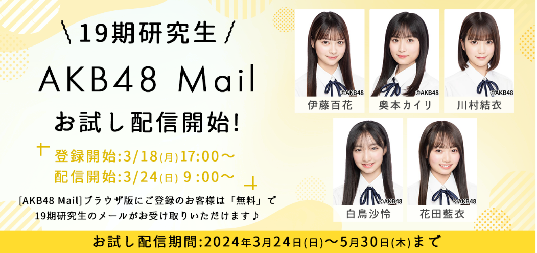 3月24日(日)9時より、19期研究生5名のAKB48 Mailお試しメールサービスを開始いたします!