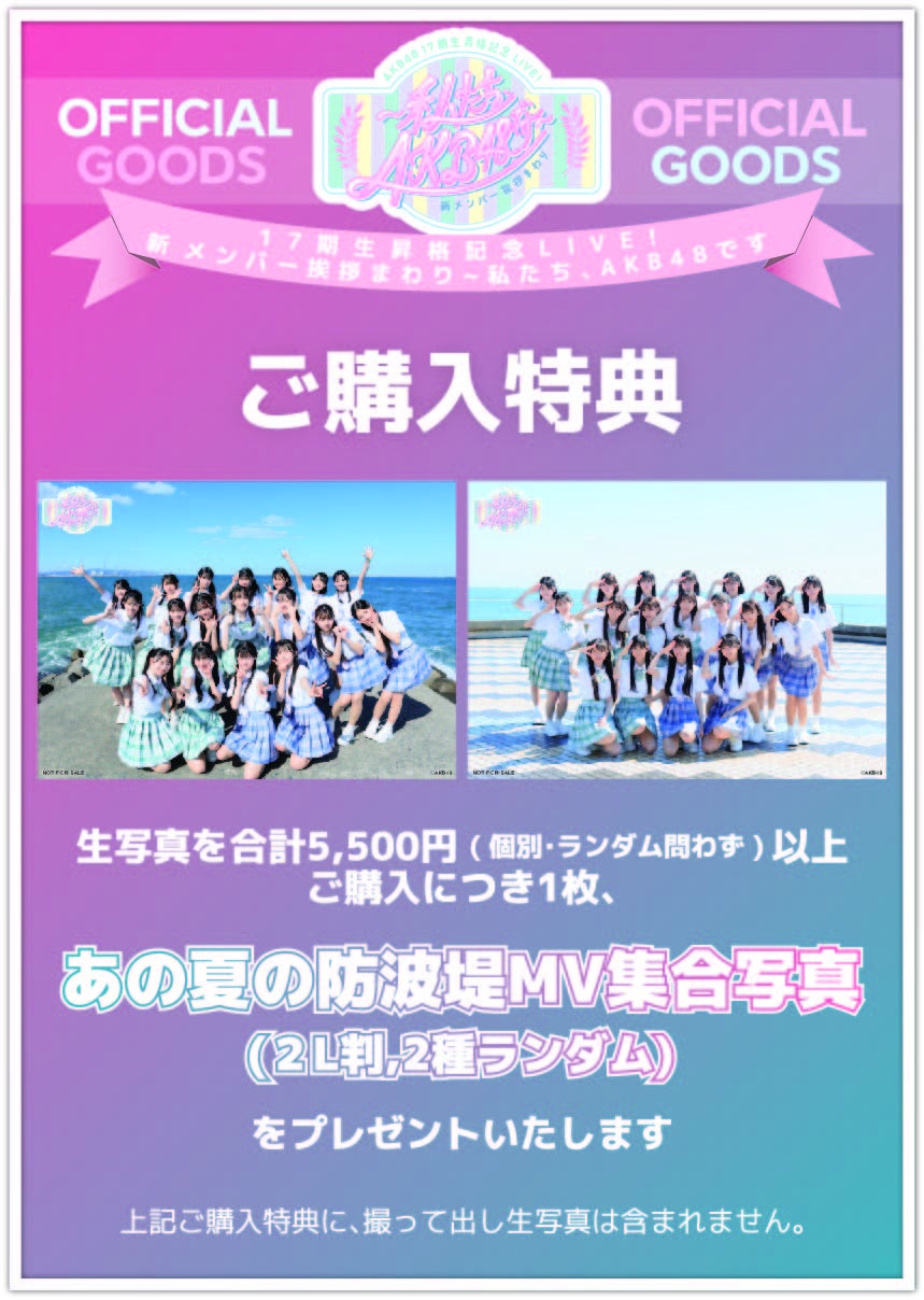 ①生写真を合計5,500円(税込み)以上ご購入につき、1枚【あの夏の防波堤MV集合写真(2L版,2種ランダム)】をプレゼント