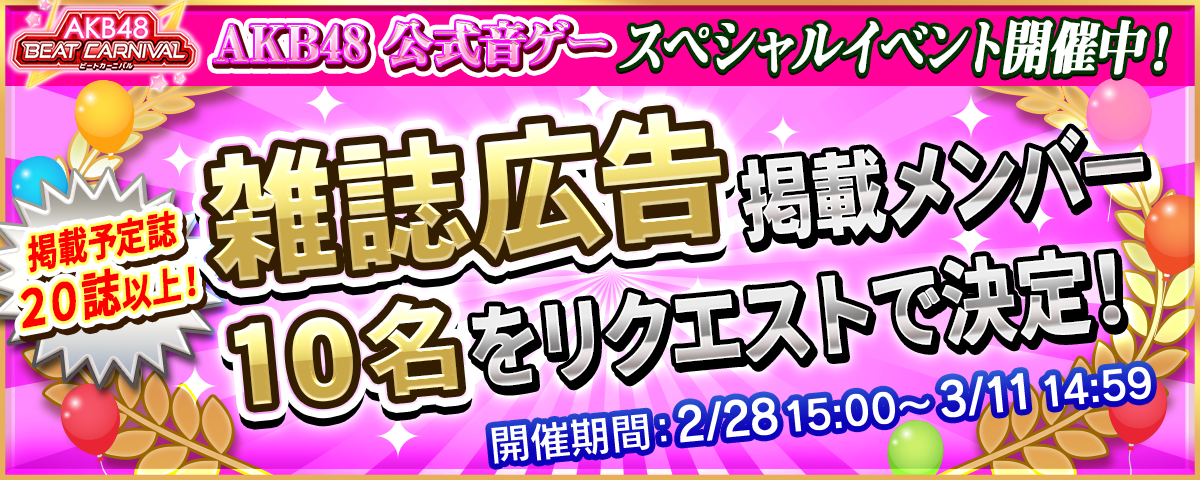 AKB48公式音ゲースマホアプリ「AKB48ビートカーニバル(Aビート)」にて、2/28(木)17:00より、当ゲームの【雑誌広告掲載メンバー10名】を決定するイベント「ジャーバージャ祭 広告選抜決定戦!」を開催します!