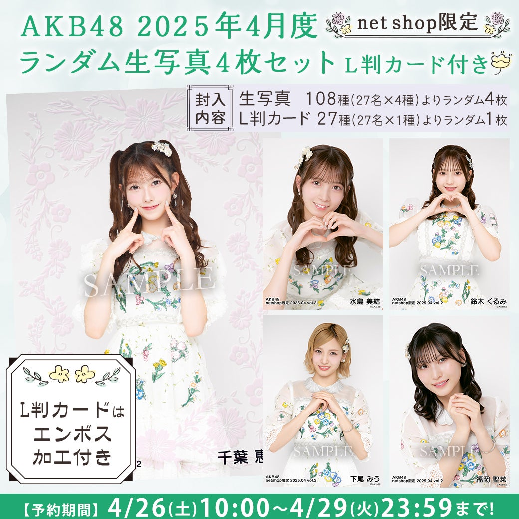 AKB48 2025年4月度 net shop限定ランダム生写真4枚セット(L判カード付き) 1,300円(税込)