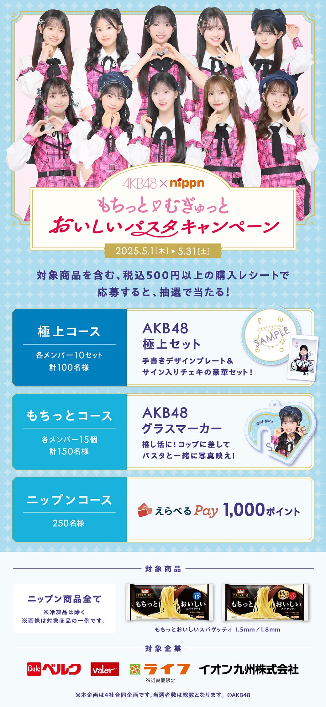 『AKB48』『ニップン』のコラボ企画 「もちっと♡むぎゅっとおいしいパスタキャンペーン」開催!