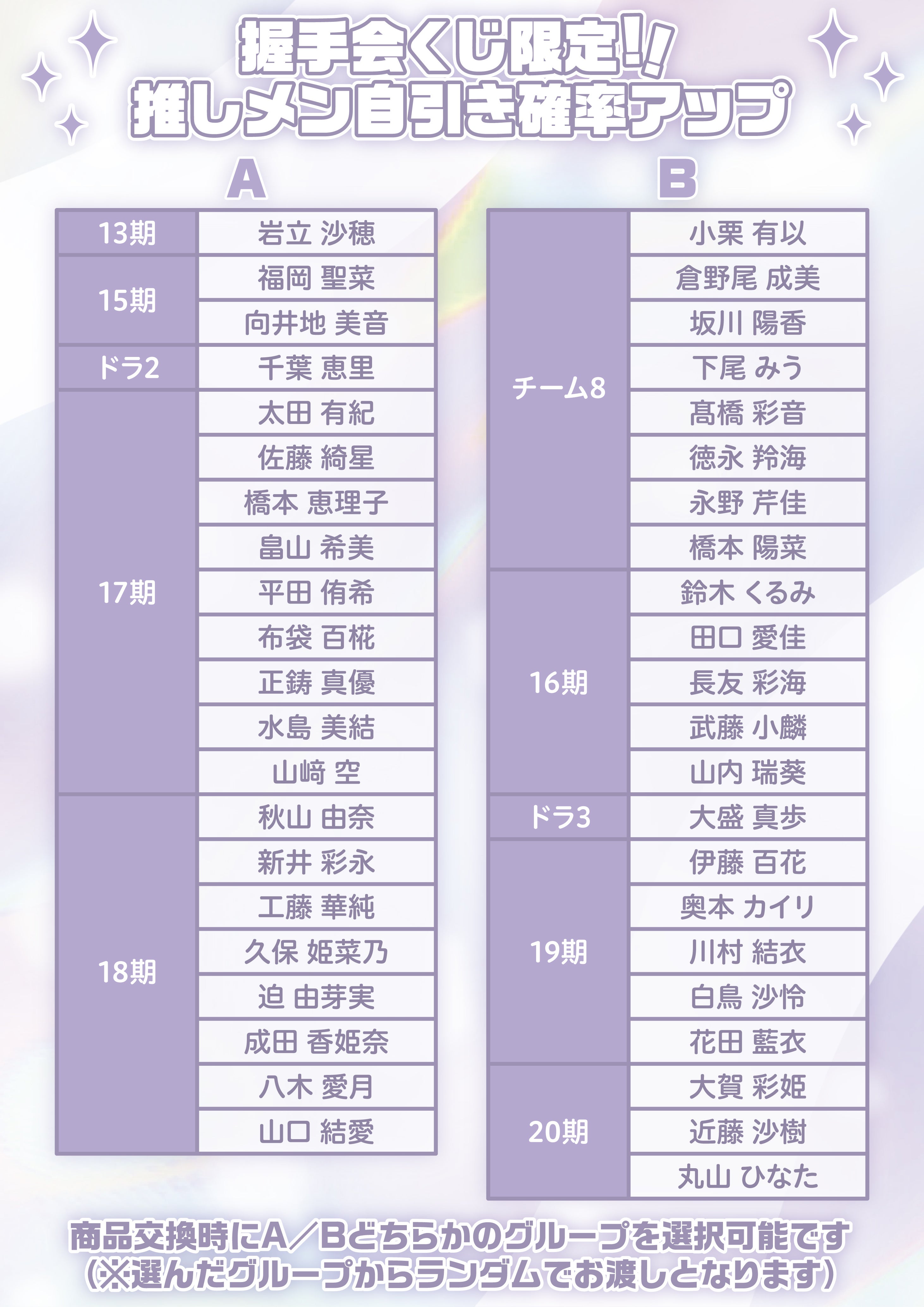 グループAは21名、グループBは22名のランダムとなっておりますので推しメンが中々当たらない・・・とお悩みのあなた!