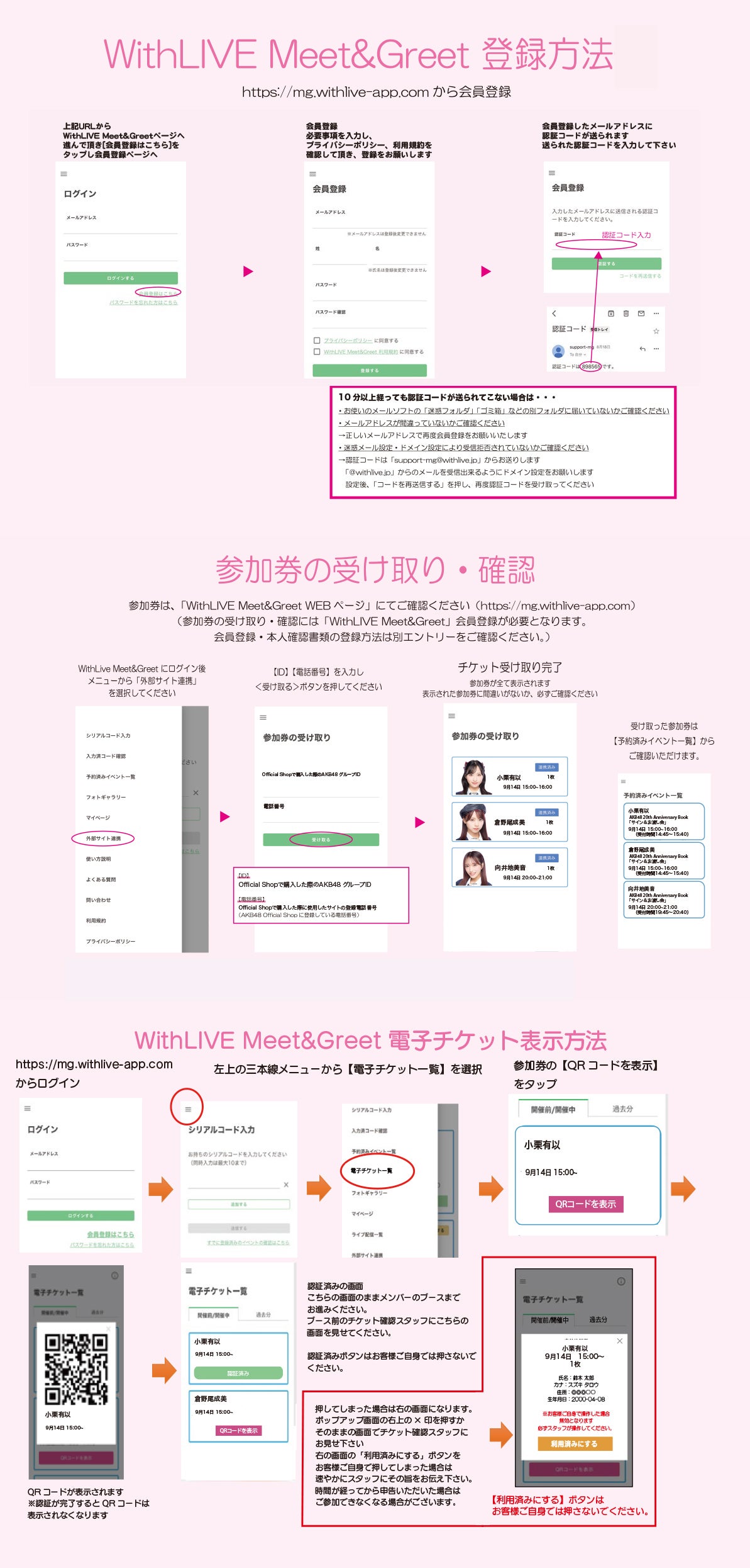 「WithLIVE Meet&Greet」ウェブページ上にて会員登録を完了されましたら、参加券の受取・確認を行ってください。