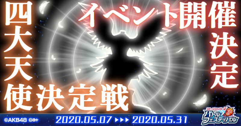 『AKB48ステージファイター2 バトルフェスティバル』において、天使の衣装をめぐってゲーム内ランキングを決める戦い、『四大天使決定戦』イベントを2020/05/07(木) 17:00より開催することをお知らせします。