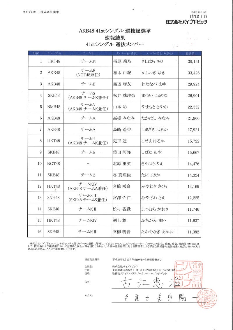 「AKB48 41stシングル 選抜総選挙」速報結果