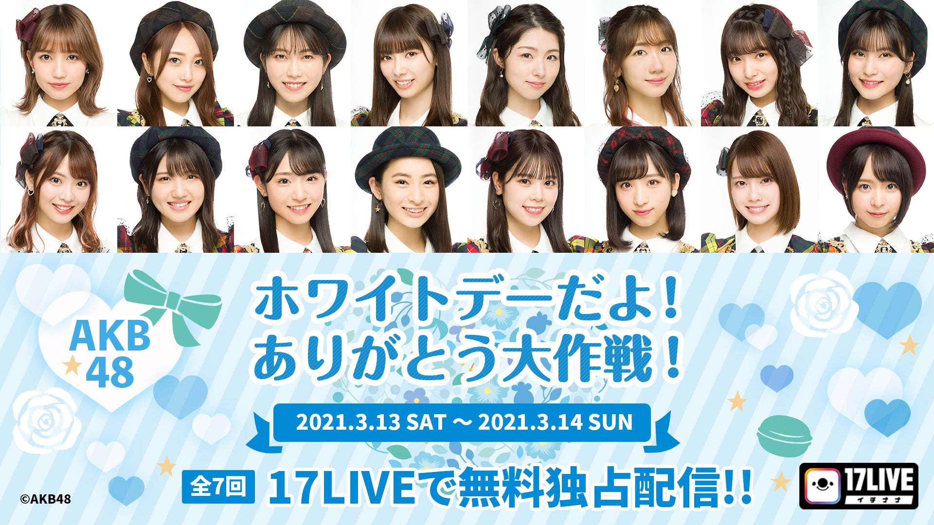 2021年2月12日(金)〜14日(日)の3日間(全7回)、AKB48メンバーのオリジナル料理対決を配信した「AKB48 どっちが食べたい?手作りバレンタインバトル!」に続き、メンバーがホワイトデーにファンの方や家族・いつも支えてくださるみなさまへ「ありがとう」の感謝の気持ちを伝える「ホワイトデーだよ!ありがとう大作戦!」を、3月13日(土)、14日(日)の2日間(全7回)にわたり「17LIVE」でライブ配信いたします!!