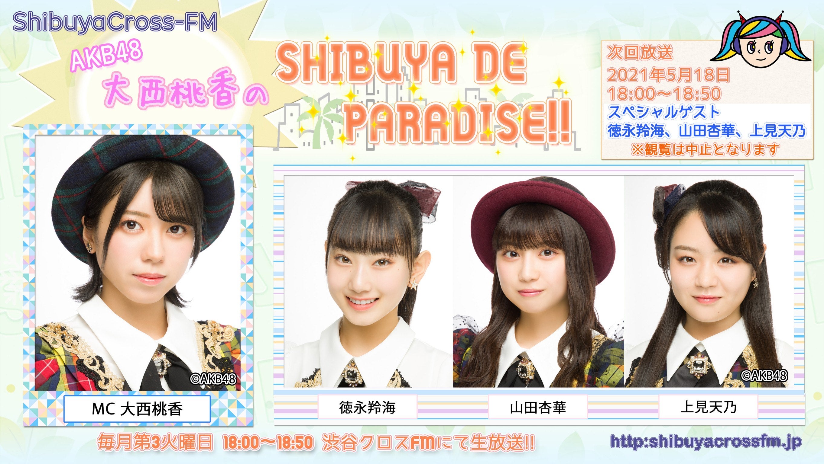 5月18日(火)18:00からの、AKB48チーム8 大西桃香の冠番組、渋谷クロスFM「AKB48 大西桃香のSHIBUYA DE PARADISE‼」は生放送でお届けします!