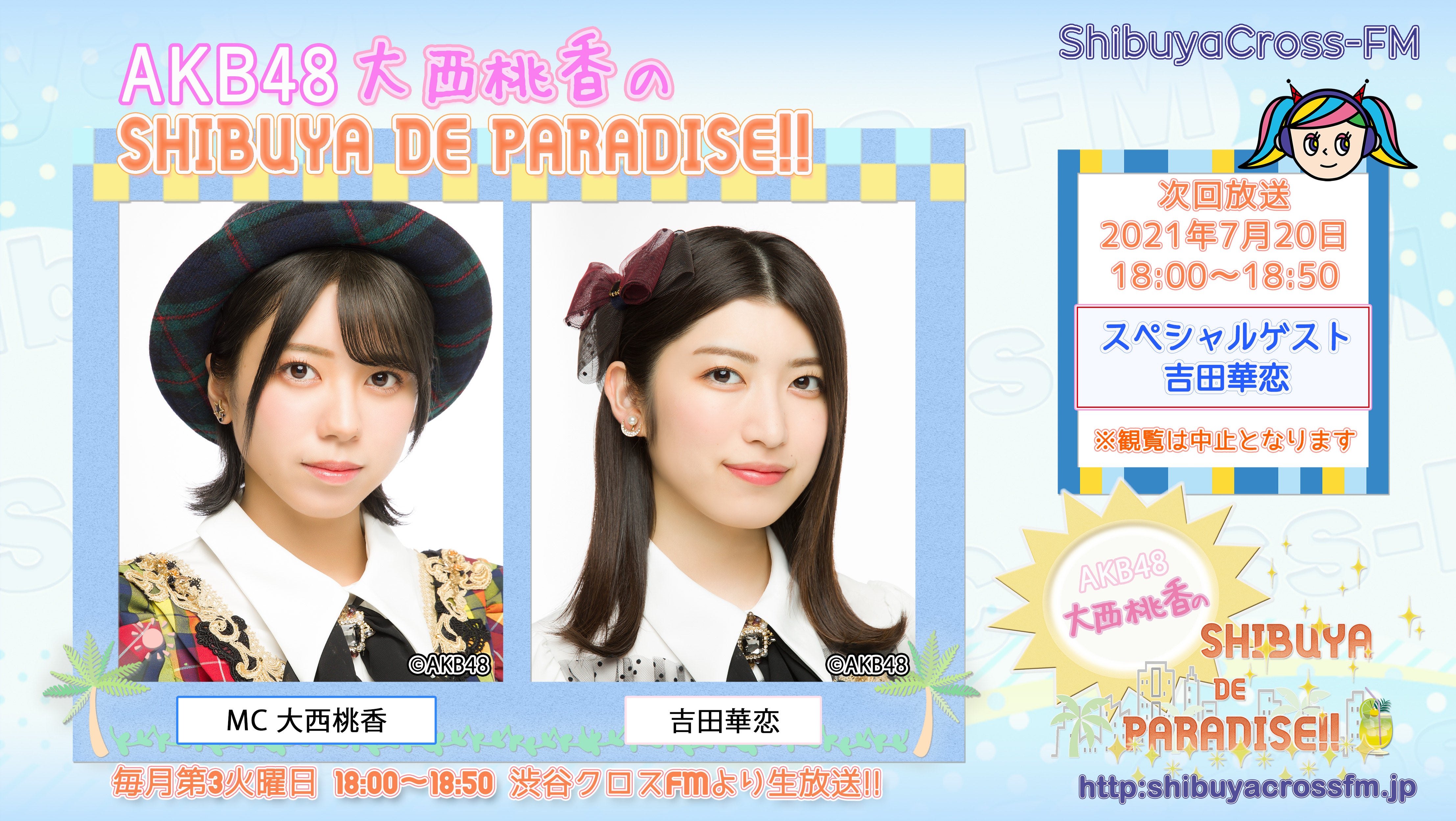 7月20日(火)18:00からの、AKB48チーム8 大西桃香の冠番組、渋谷クロスFM「AKB48 大西桃香のSHIBUYA DE PARADISE‼」は生放送でお届けします!