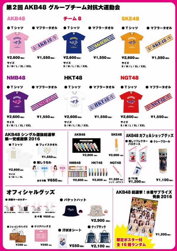 8/6(土)、7(日)にさいたまスーパーアリーナで開催される「第2回AKB48グループチーム対抗大運動会」「AKB48シングル選抜総選挙 第一党感謝祭2016 ~1,039,172票の愛にありがとう!~」のグッズ販売詳細をお知らせします。